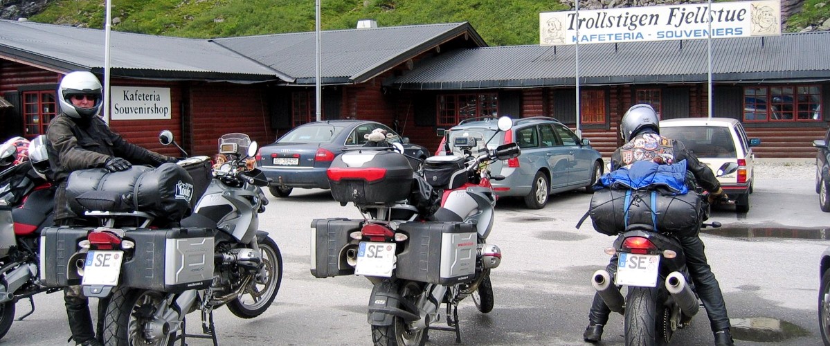 Jetzt sollte es an die Abfahrt gehen. Angesichts der Hunderten von Bussen, Autos, Wohnmobile etc. ahnten wir schon vorher, dass der Spaß auf der Strecke bleiben würde. Und richtig. In jeder Kehre hatten wir große Mühe, um nicht aufgrund mangelnder Geschwindigkeit umzufallen. Wohnmobile schoben sich in Zeitlupe aneinander vorbei, Wohnwagen warteten in Ausweichbuchten, bis die entgegenkommenden Reisebusse vorbei waren...und wir immer dahinter. Es machte keinen Spaß, aber es war ja auch verständlich. Denn nicht nur wir wollten die Trollstigen einmal befahren haben, sondern wahrscheinlich jeder Touri, der sich gerade im Lande Norwegen befand. Und so rollten wir nach der Abfahrt etwas enttäuschend auf einen Parkplatz, um noch einmal ein letztes Foto zu machen.