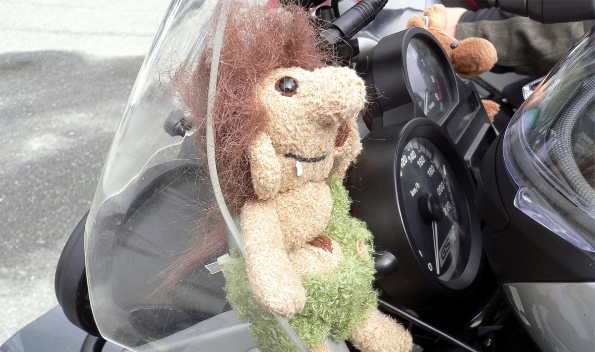 Dies war schwieriger als zuerst angenommen. Alle Trolle waren entweder aus hartem Material oder zu niedlich. Nach langem Suchen fanden wir schließlich einen...schön aus Stoff, geeignet um ihn mit einem Kabelbinder am Mopped zu befestigen und dazu auch noch schön hässlich. Jepp, den wollten wir...
