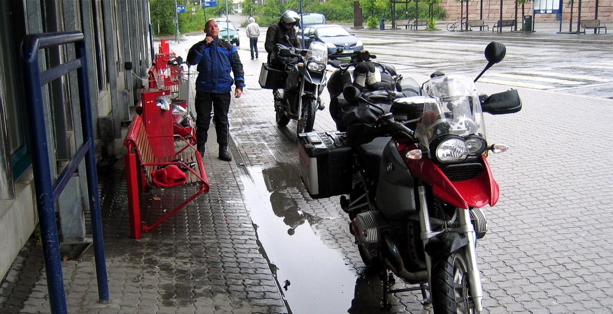Der nächste Morgen begrüßte uns mit Dauerregen und Null Aussicht auf Besserung. Nach den leckeren Frühstück packten wir unsere Klamotten und schleppten erst einmal alles wieder nach unten. Dann holten Micha und ich die Moppeds, während Axel auf unsere Sachen aufpasste. Als wir zurück waren, tapperte dann Axel los, um seine Maschine vom hinteren Bahnhofsparkplatz zu holen. Im Schutze des Überdaches verzurrten wir alles fest. Ein Blick nach oben genügte, um zu erkennen, dass wir heute definitiv nicht ohne Regenzeug auskommen würden. Also Klamotten an...