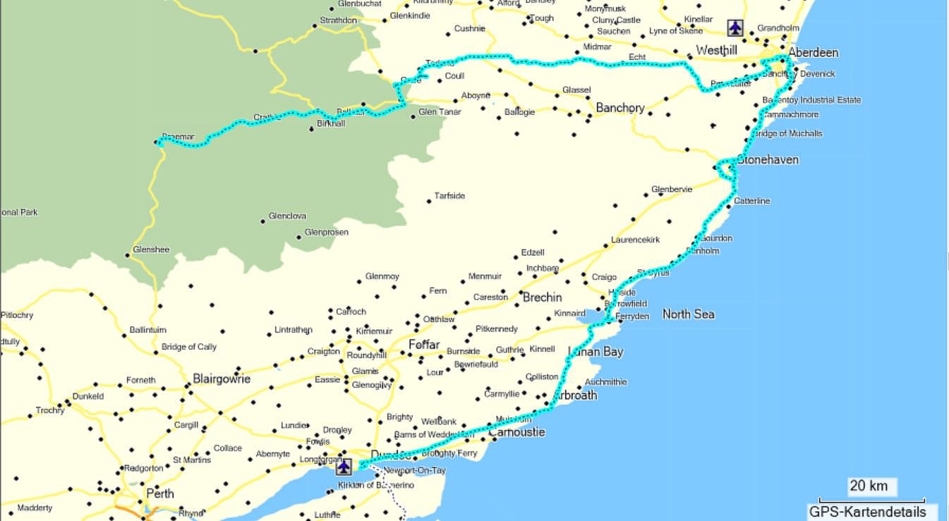 Um 9:45 Uhr sitzen wir auf den Moppeds und versuchen Dundee in Richtung Norden zu verlassen. Aufgrund diverser Baustellen kein Leichtes Unterfangen, nach 3 Ehrenrunden dann aber doch erfolgreich. Ab hier geht es fast ausschließlich entlang der Nordseeküste auf der "Angus Coastal Tourist Route" bis nach Aberdeen.