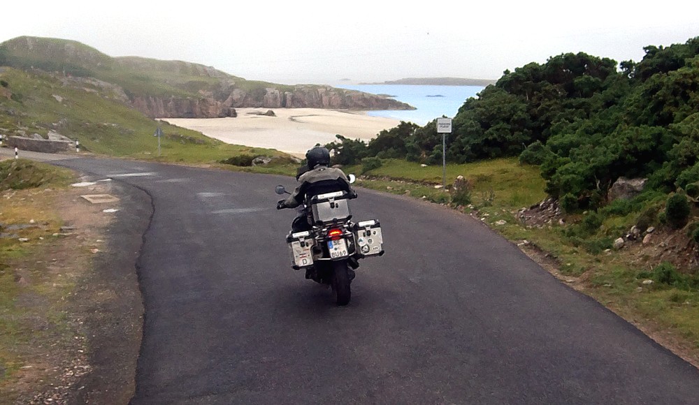 ...und landen schließlich am Ceannabeinne Beach in der Nähe von Durness. Durch Zufall sehen wir ein Wohnmobil, welches rechter Hand oben auf einer Klippe thront. Klar, dass wir ebenfalls diesen Punkt für eine Rundumsicht nutzen wollen.