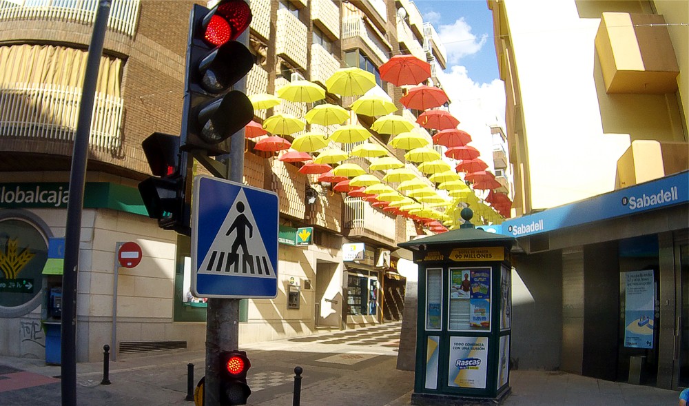 rote und gelbe Schirme als Sonnenschutz und Attraktion für Touristen