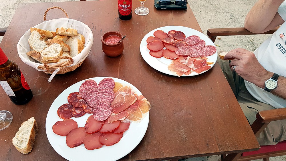 Nach einem Bierchen auf der Terrasse und mit der Qual der Wahl zwischen den Gerichten "Huevos Rotos" (zerbroche Eier), "Madejas" (Stränge) und "Oreja frita" (gebratenes Ohr), entscheiden wir uns für eine Nur-Fleisch-Platte mit Namen "Tabla de Ibericos". Damit sollte man eigentlich nicht viel verkehrt machen.