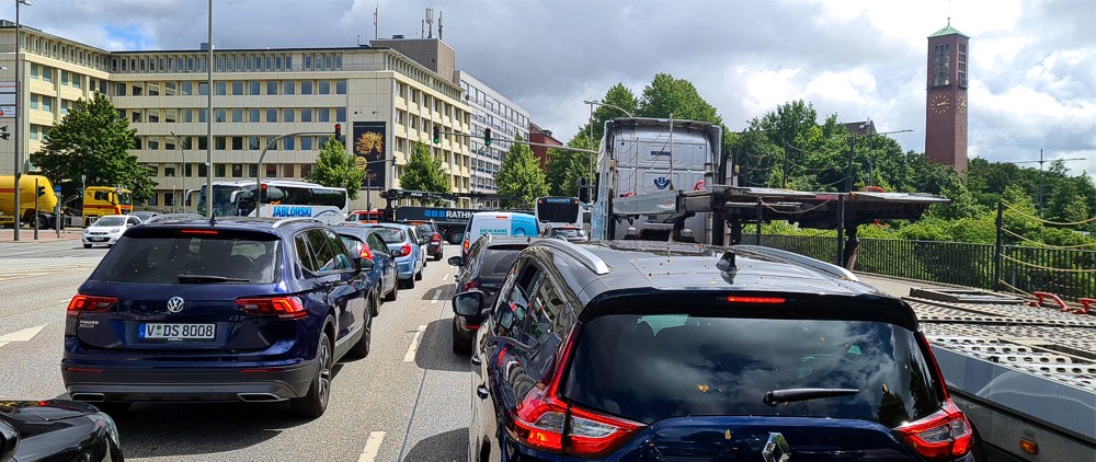 Wir kommen etwa 15 Kilometer weit bis Hamburg-Mundsburg, dann stehen wir im Stau. Toller Vorschlag...