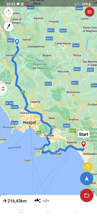 Nach etwa 50 Kilometern auf der Amalfitana verlassen wir diese gen Norden und fahren weiter Richtung Pompeji und damit zu unserem nächsten Highlight, dem Vesuv.