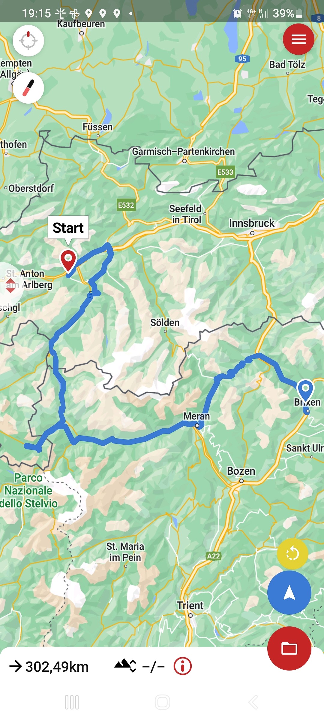 Nach dem 3. Kreisverkehr und völliger Ratlosigkeit in welche Richtung es weitergeht, halten wir an einer Tanke. Ein österreichischer Biker erkennt die Situation und bietet uns spontan an, ihm die nächsten 10 Kilometer zu folgen, bis wir wieder auf der Straße zum Reschenpass sind. Ziemlich zügig und kurvig geht es tatsächlich über eine tolle Nebenstrecke zurück zur Hauptstraße. Das nenn ich doch mal Service, vielen Dank noch einmal an den Ösi-Biker.