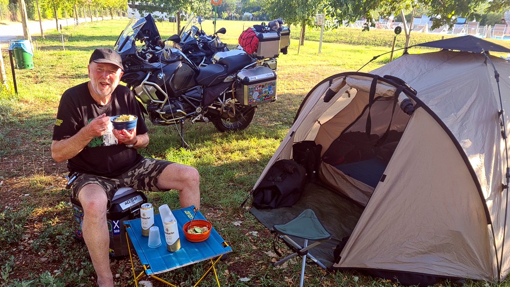 Der Platzbetreiber empfängt uns freundlich und aufmerksam. Er ist selber Motorradfahrer und Treiber einer Africa Twin und so dauert es natürlich nicht lange, bis sich Gesprächsstoff und Sympathie aufbauen. Wir bekommen einen schönen schattigen Platz mit eigenem Wasseranschluss und einer Holzsitzgruppe ganz in der Nähe. Einziges Manko: der Weg zum Waschhaus und Klo ist etwas weit. Aber das haben wir uns selber zuzuschreiben, da der Wunsch nach Schatten größer ist als das Bedürfnis alter Leute.